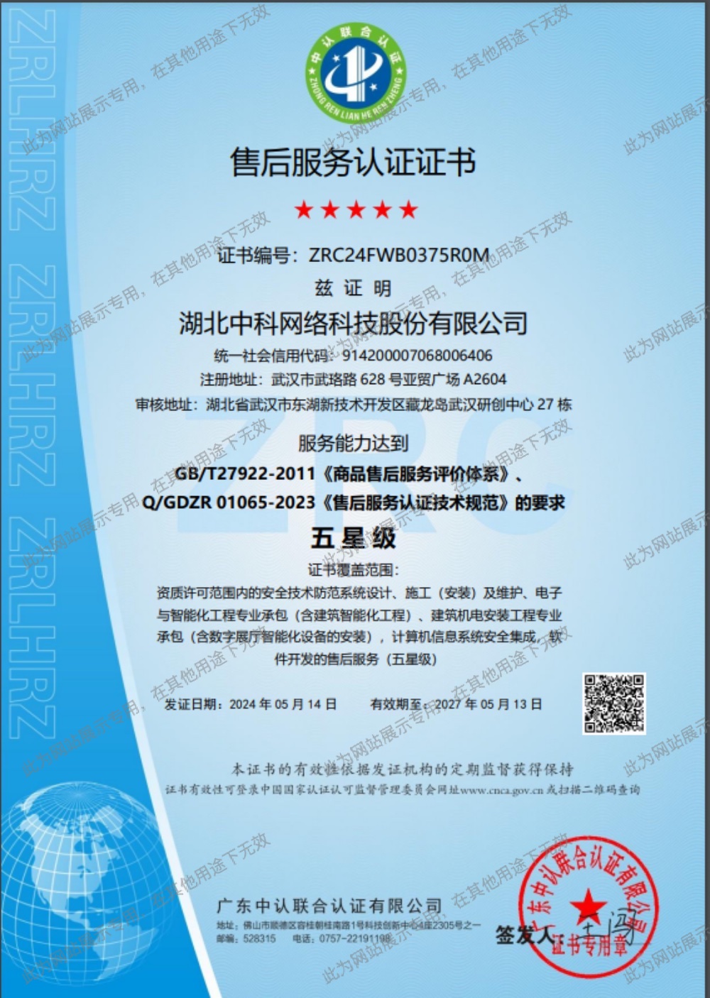 • 五星級(jí)售后服務(wù)認(rèn)證證書